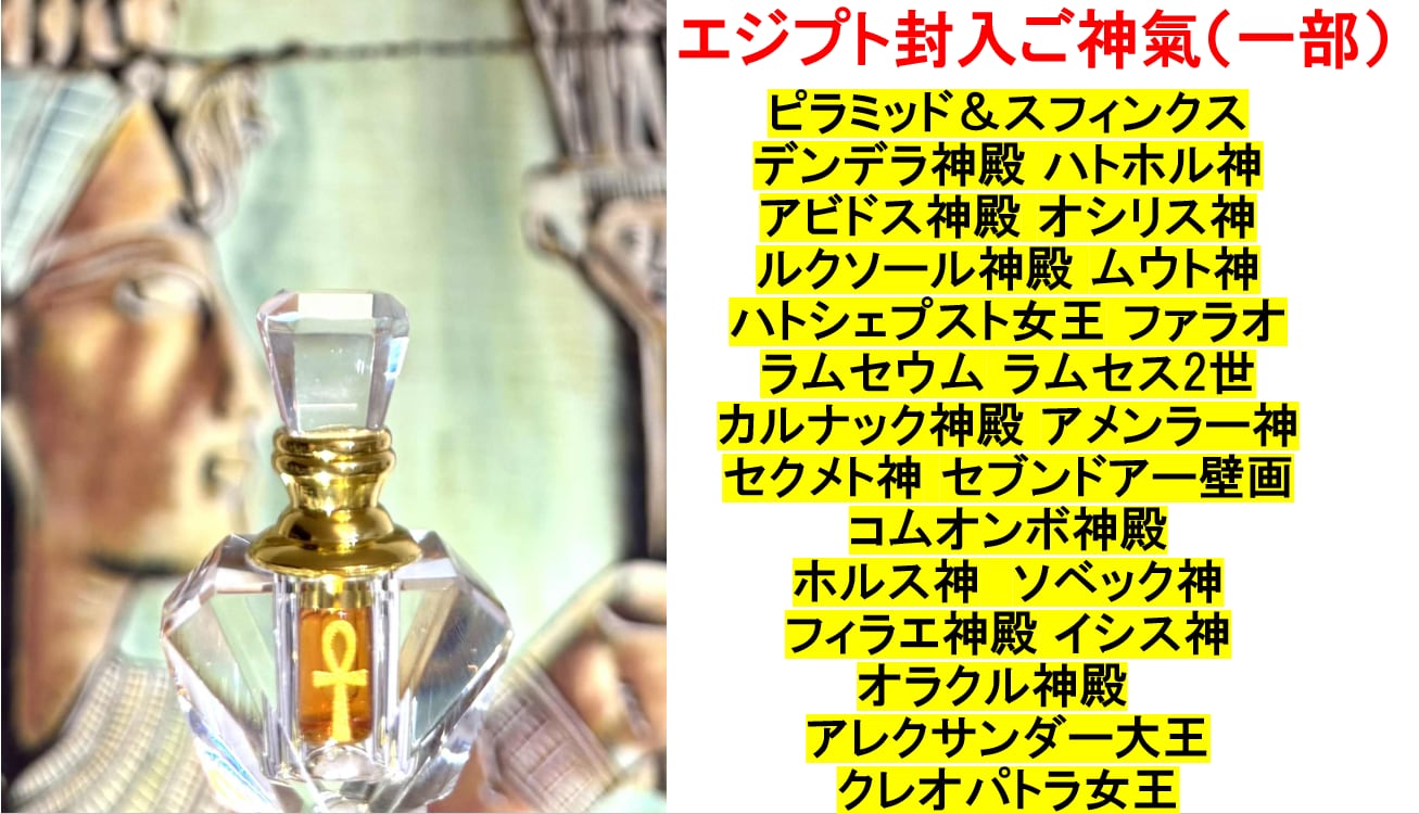 世界最高パワースポットのエジプトのデンデラ(ハトホル)、イシス、アビドス(オシリス)、オラクル神殿などの各神殿と、ギザの大ピラミッド&スフィンクスの高波動エネルギーをエジプト現地で封入した特別な香油です。