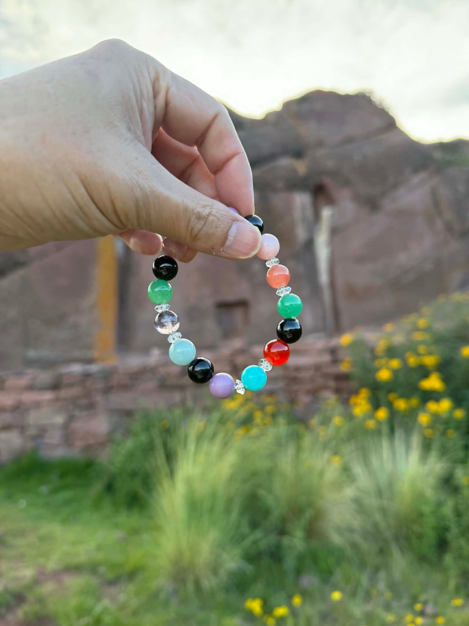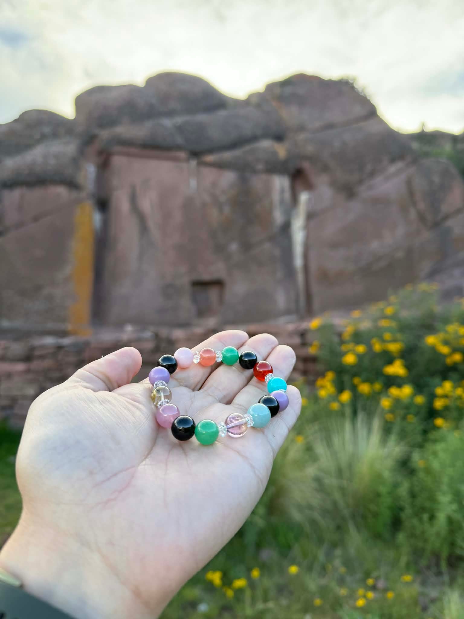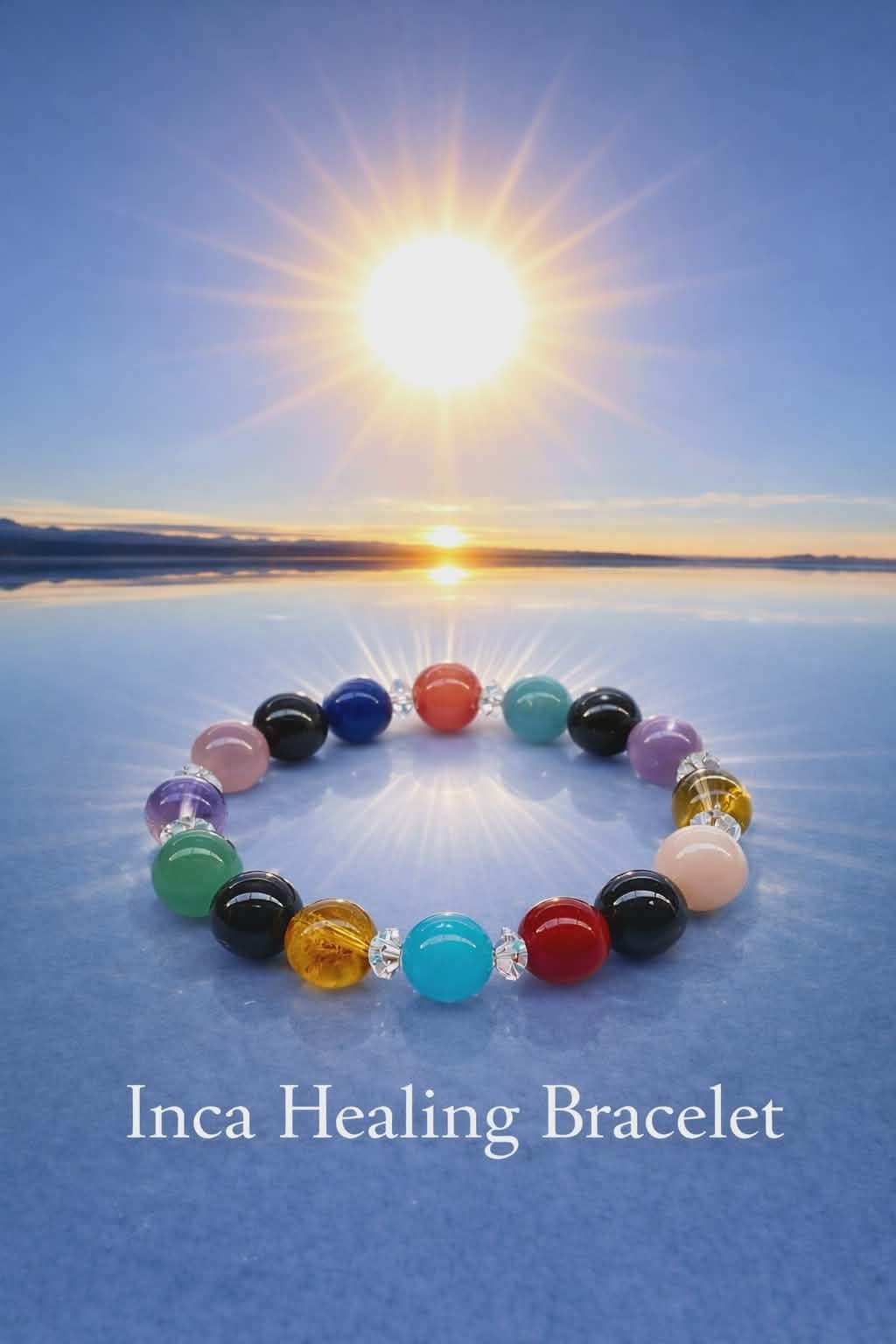 制作意図:古代インカ文明の聖地に宿る叡智と、大地・水・太陽・空のエネルギーを統合し、魂のエネルギーと現実世界での具現化を同時に促進するために組まれた、特別なアセンション・ヒーリングブレスレット。