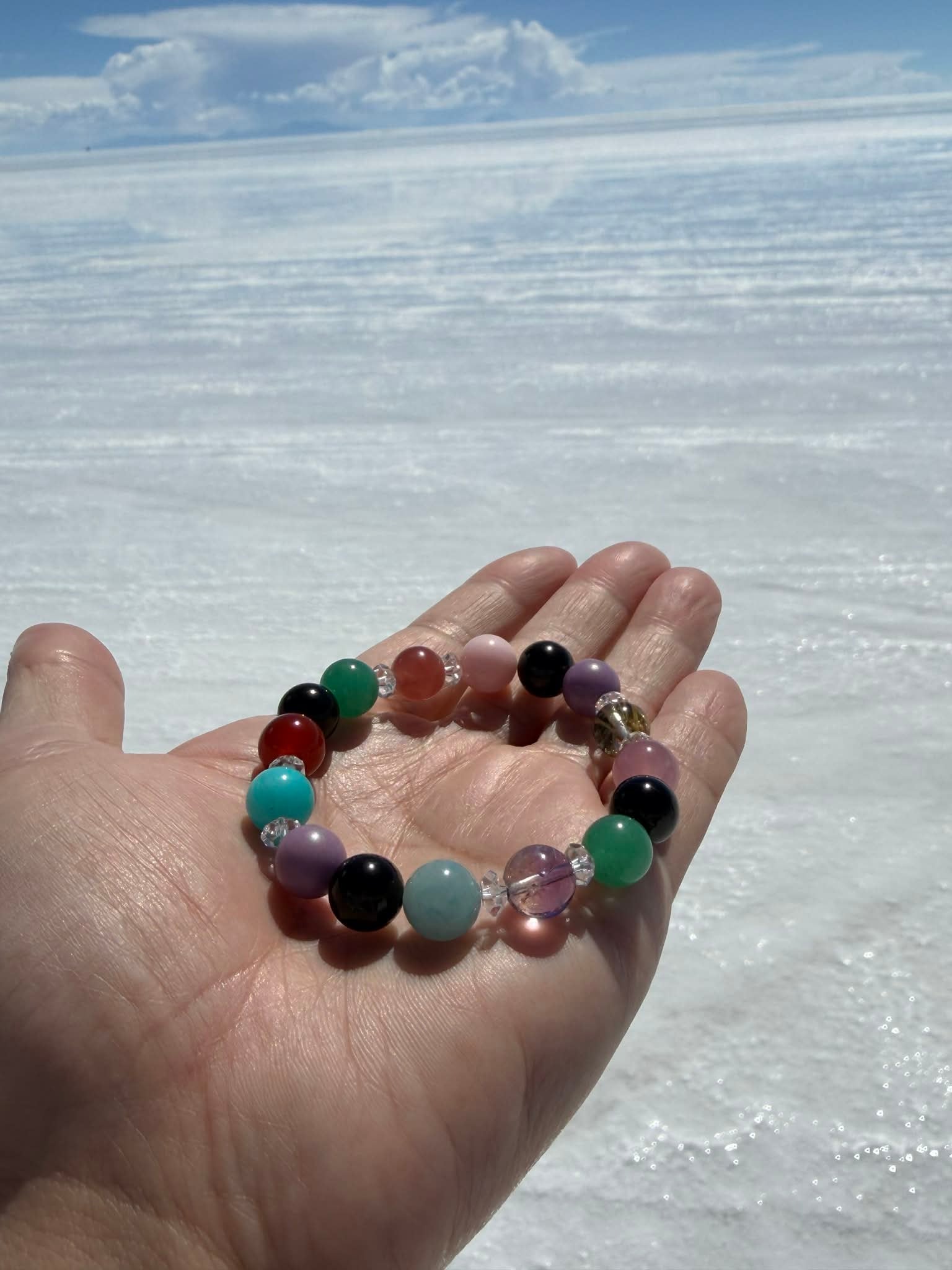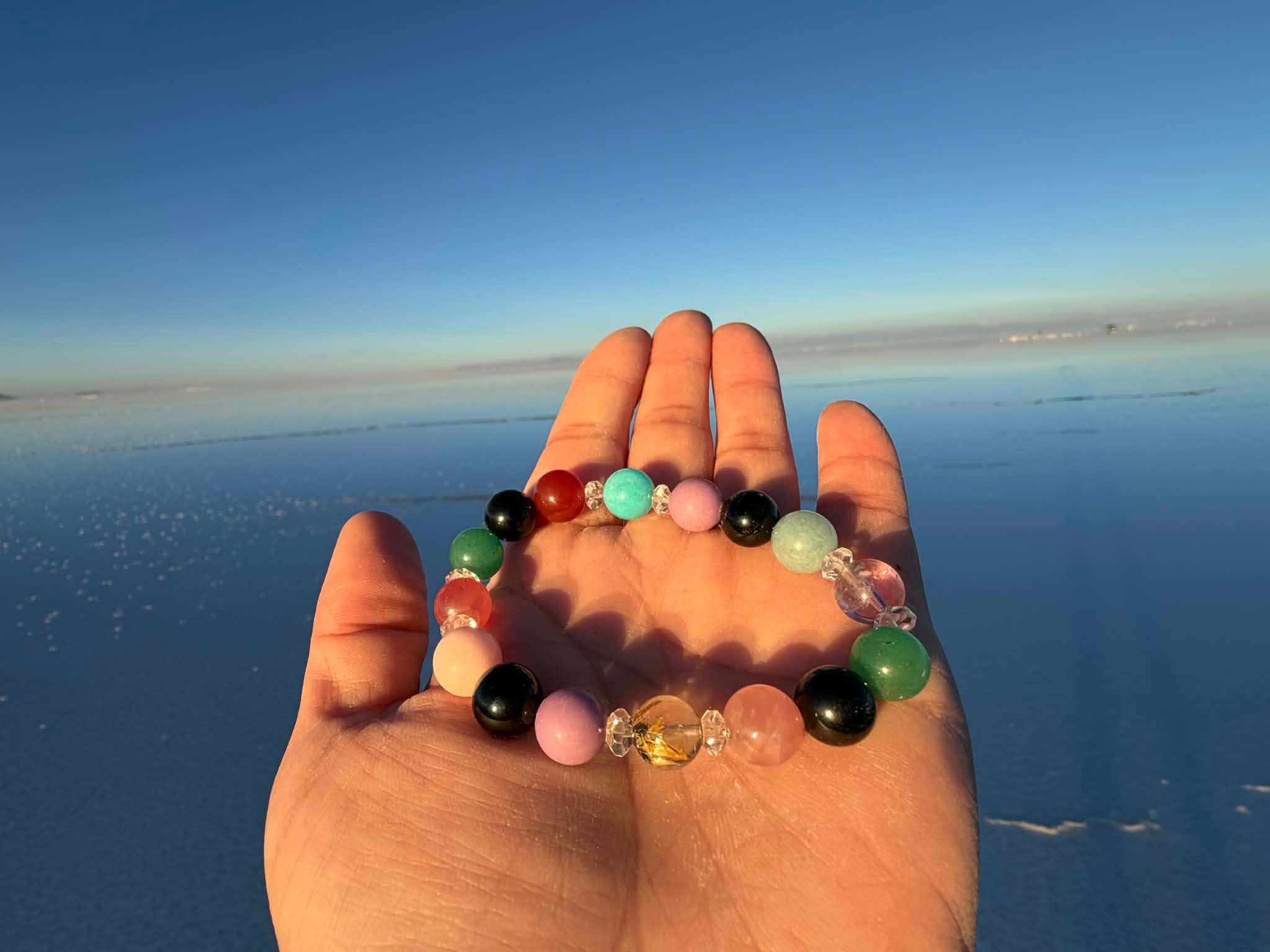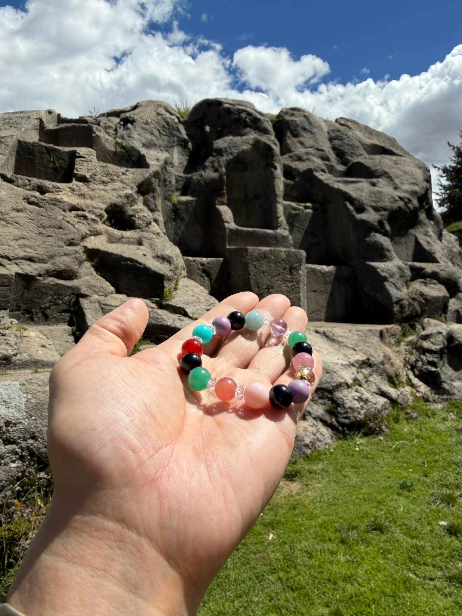 制作意図:古代インカ文明の聖地に宿る叡智と、大地・水・太陽・空のエネルギーを統合し、魂のエネルギーと現実世界での具現化を同時に促進するために組まれた、特別なアセンション・ヒーリングブレスレット。